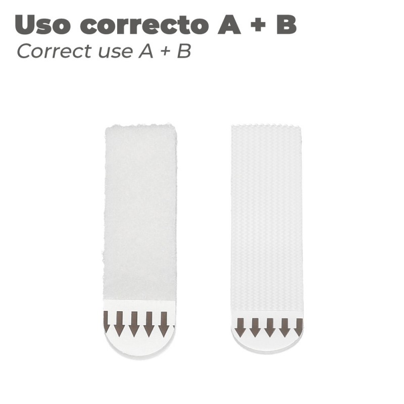 - Cada tira tiene ambas partes del velcro (gancho y felpa)
